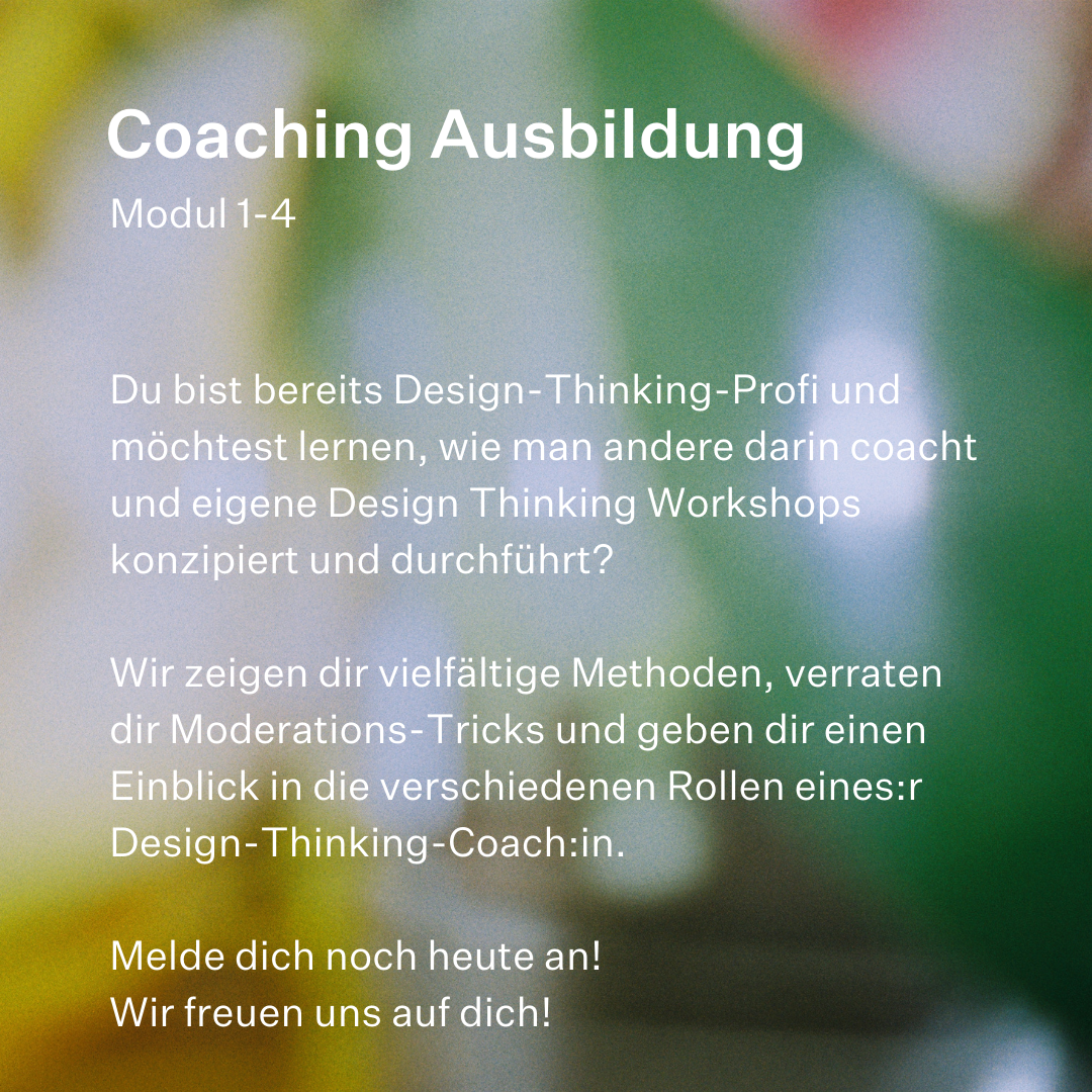 Lernt mit uns in unserem Train-the-Trainer:innen-Format die Grundlagen des Design-Thinking-Coachings. An drei Tagen zu je fünf Stunden geben wir euch alles an die Hand, was ihr braucht, um eure ersten eigenen Workshops zu planen und durchzuführen. Wir besprechen Themen wie Creative Confidence, die Rolle des:der Coach:in, Teamdynamik, Partizipationsmethoden, Auftragsklärung sowie Format- und Agenda-Entwicklung. Darüber hinaus tauchen wir in die Design-Thinking-Methodik ein und geben einen Überblick über die Design-Thinking-Prozessschritte und Methoden.